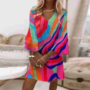 Curved Stripes Multi-Color Bell Sleeve Mini Dress