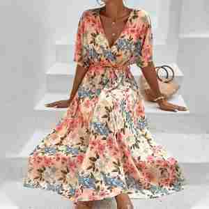 Glam Peach Floral Print Short Sleeve Maxi Dress