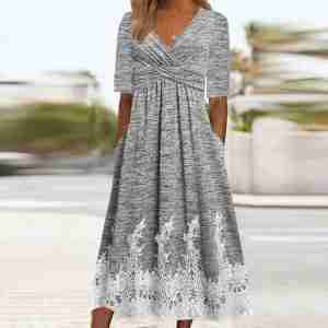 Grey Print Half Sleeve Midi Dress