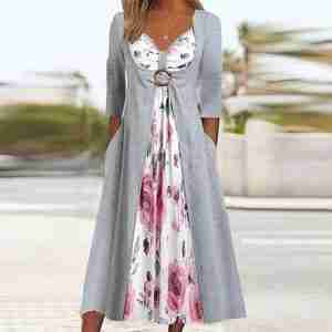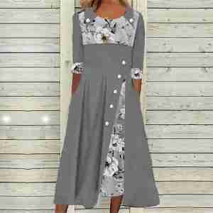 Grey Floral Print 3/4 Sleeve Midi Dress