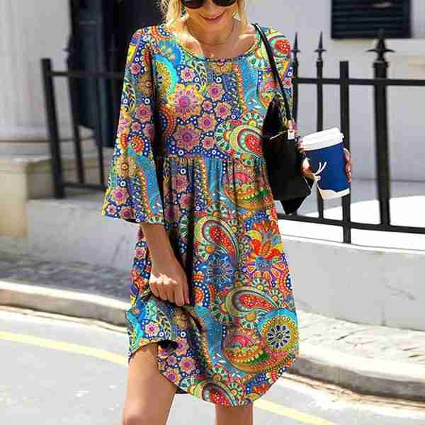 Make this adorable mini dress a part of your summer and year-round wardrobe! Splashes of pinks, blues, greens, reds, and white cover this chic empire waist dress, forming oversized paisleys and daisies. Light pleating on the waist, a scoop neck collar, and bell sleeves gives this cute short dress a babydoll look.