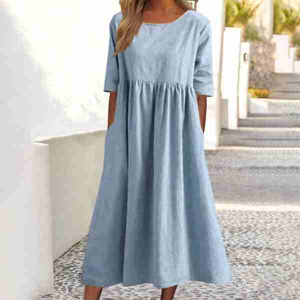 Spend relaxing days and nights in chic summer style wearing this chambray midi dress. A round neckline, short sleeves, and pleated empire waist make this adorable dress comfortable and figure-flattering. Side pockets add a relaxed vibe plus versatility. Finish your look with sandals, jewelry, and a cardigan. Machine wash normal with light colors or hand wash. May be hung up to dry or lay flat. Light ironing if needed.