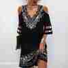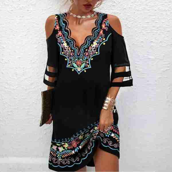 Refresh your style with this cold shoulder black mini dress featuring a vibrant Aztec ethnic print on a plunging v-neckline and bottom trim, elevating it to next-level chic. Cut-outs on the short sleeves and gentle pleating give this super-cute dress a flirty vibe, perfect for wearing on date night, a casual day, and so much more. Machine wash cold tumble dry low to medium heat. Iron if needed or lay flat to dry.