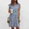 For work, play or any day, this shift will be the one we slip on over and over again. Printed with a spunky ikat-style pattern, the blue and white frock flaunts a sleek shift shape with a split neckline and ruffle-trimmed cap sleeves. Wear it for fall sorority rush with pleated sandals and huggie hoop earrings.