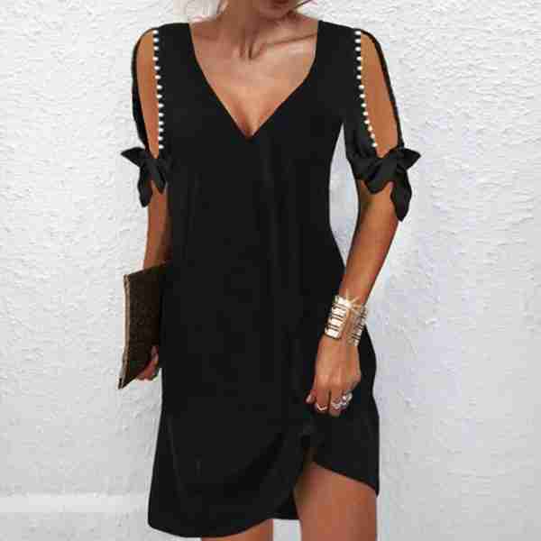 Add this sultry yet sweet black mini dress to your LBD dress collection. The short length split sleeves are embellished with white detailing, complementing the plunging v-neckline and loose-fitting mini-length silhouette. Add your favorite heels, flats, or boots, and finish with your jewels. Machine wash cold tumble dry low to medium heat. Iron if needed or lay flat to dry.