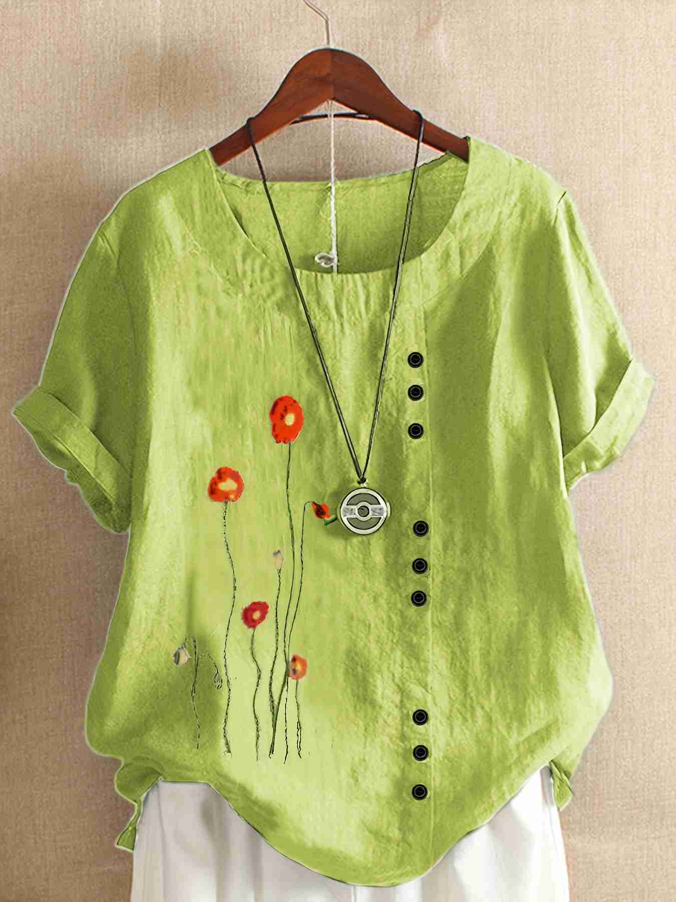 Plus Size Floral Print Round Neck Linen T-shirt, Women’s Plus Casual Short Sleeve Tee