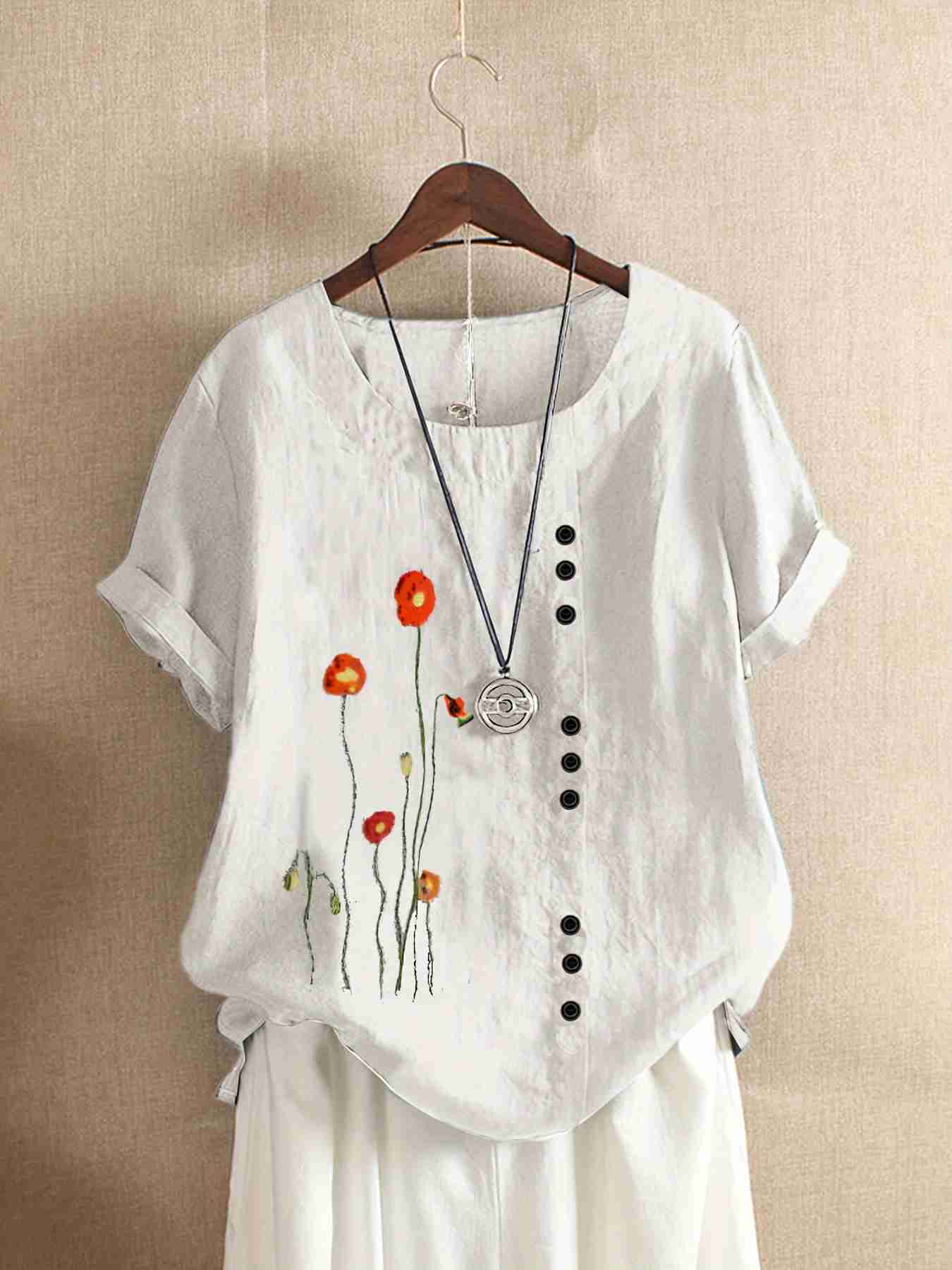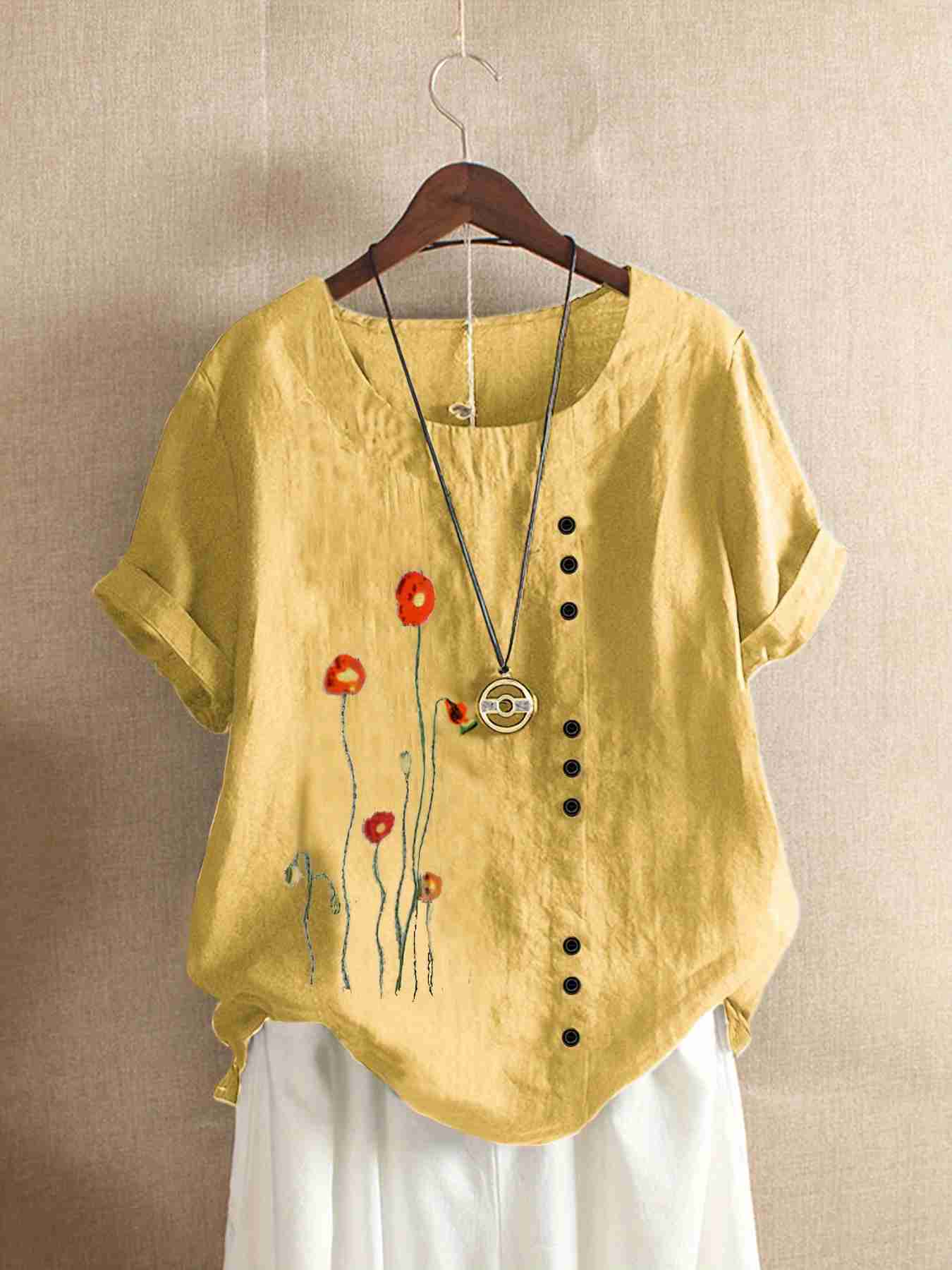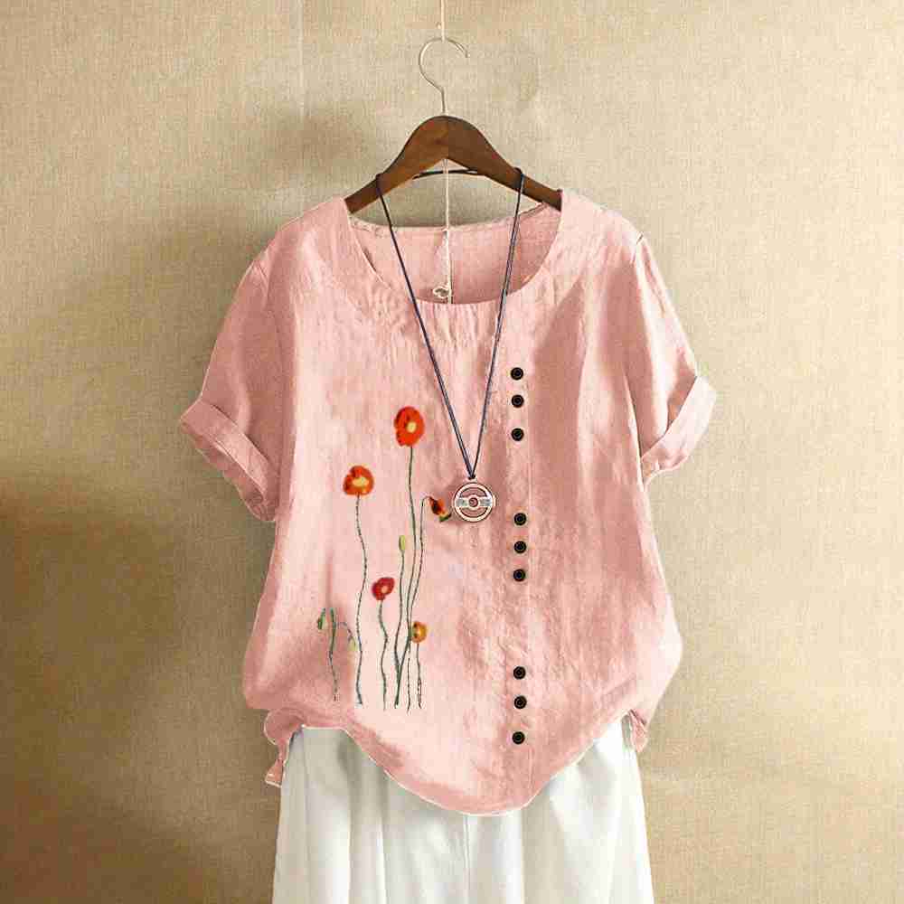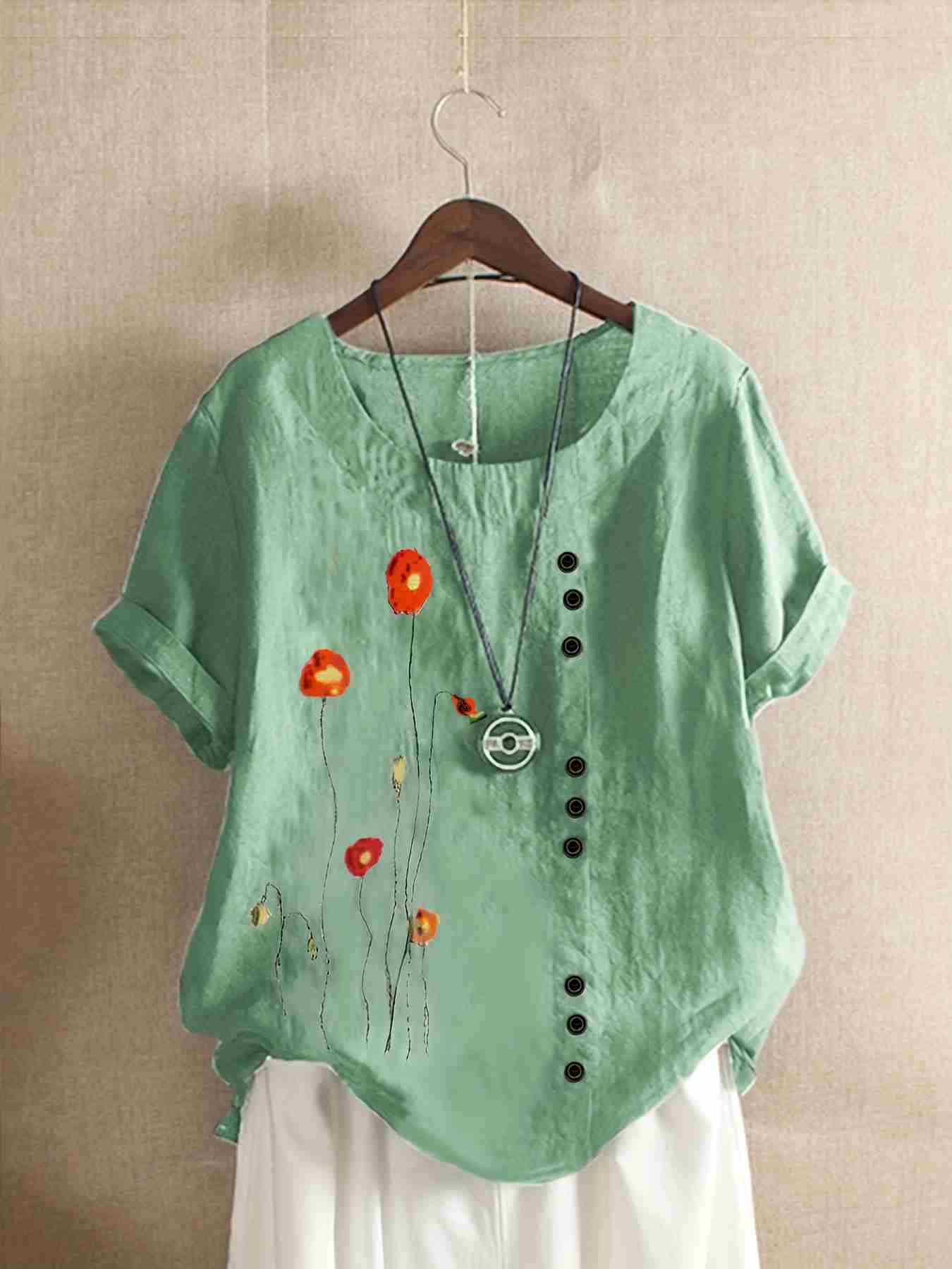 Be the first to review “Plus Size Floral Print Round Neck Linen T-shirt, Women’s Plus Casual Short Sleeve Tee”