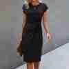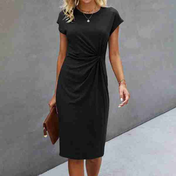 This plain black shift dress features a body-skimming fit with a swirling pleated fixed-waist silhouette, highlighting the figure with sophistication and chic style. The scoop neck collar, knee-length bottom, and short sleeves make it perfect for so many different occasions.