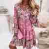 This pretty prairie dress features pink and red flowers intermingling with other soft summer and spring colors in a swirling pattern. The button-up v-neckline, lantern sleeves, and tiered bottom give it a chic bohemian fit. Pair this unique vintage-inspired mini dress with booties, flats, heels, or wedges.
