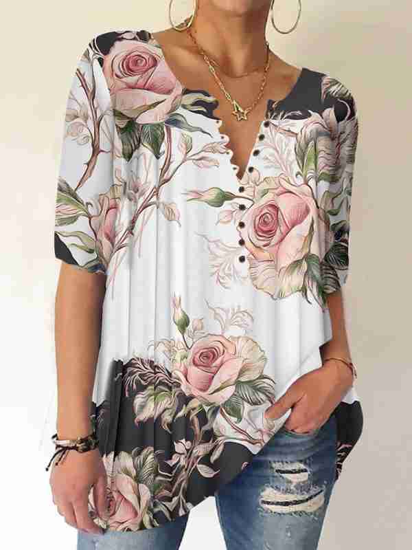 Women Half Sleeve V-neck Floral Printed Button Tops