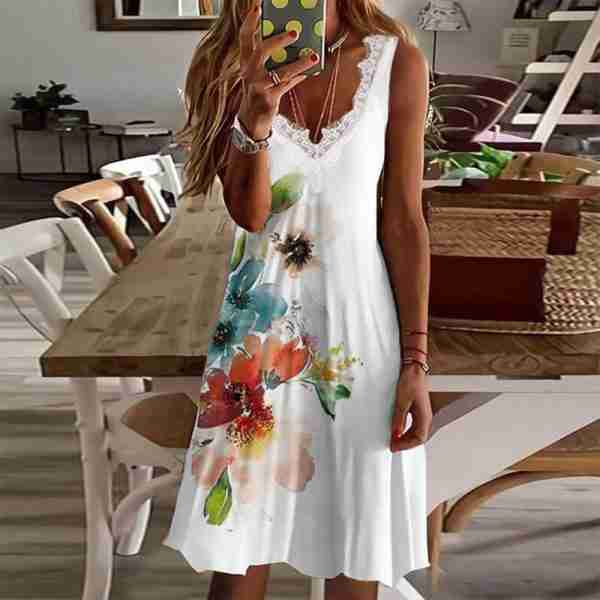This beautiful floral print mini dress features a looseA-line silhouette, making it the perfect complement to any summer day or vacation. The cut-out lace-trimmed plunging v-neckline adds effortless elegance. Add heels, wedges, flats, sandals, a denim jacket, or a light scarf for a day-to-night look.