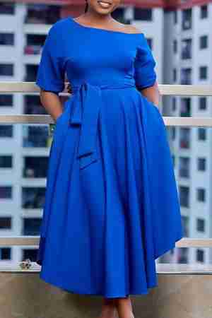 Off Shoulder Half Sleeve A-Line Tie Up Pleated Asymmetric Hemline Midi Dresses