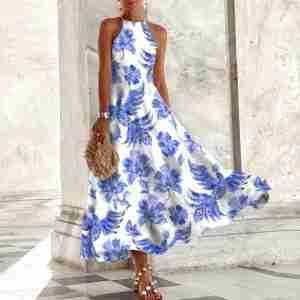 Oversized Blue Floral Print White Midi Dress