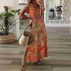Orange Short Sleeve V-Neck Maxi Dress