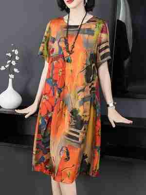 Round Neck Loose Casual Floral Print Short Sleeve Midi Dress